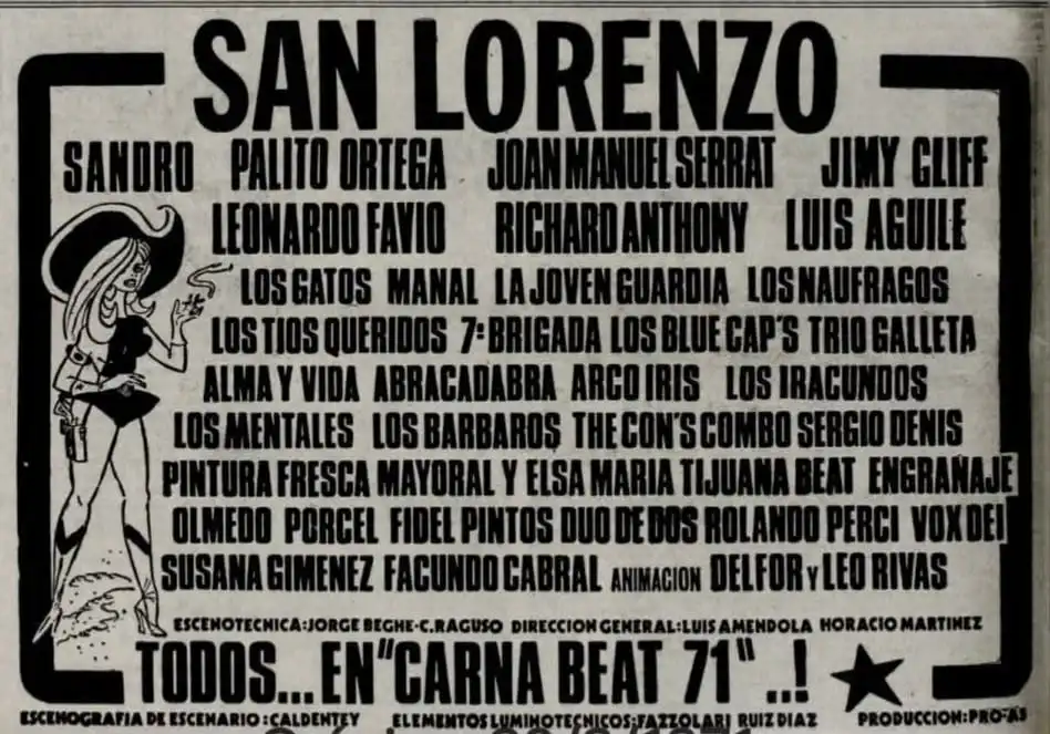 Con algo de trabajo arqueológico, podemos ubicar a Jimmy en al menos tres eventos porteños en 1971: el Carnaval Beat 71, en el club San Lorenzo, otra vez con Sandro, Palito, Favio, y con Joan Manuel Serrat, además de la participación estelar de Susana Giménez; el Show 71 Up, en el Club Deportivo San Andrés, del partido bonaerense de San Martín, donde aparece anunciado como “Jhimmy” Cliff, junto a Serrat y, por supuesto, Los Náufragos. Y el diario Crónica del domingo 21 de febrero, por otra parte, anunciaba: “Ramos Mejía, la zona de onda de hoy, [el Carnaval] tendrá su sede en Estudiantil Porteño, con la animación del ‘langa’ Juan Alberto Mateyko, anuncia a The President’s, The Rainbow, Jimmy Cliff y Joan Manuel Serrat, quien indudablemente está en todas…”.