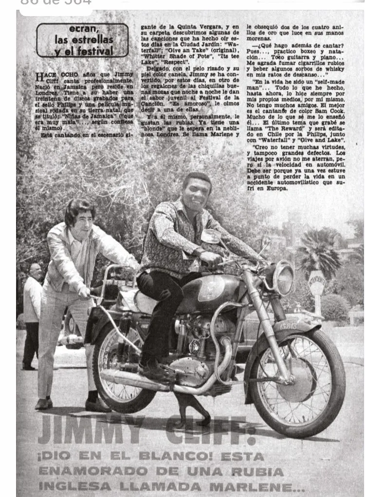 Aproximadamente entre el 15 y el 22 de enero de 1969, hay pruebas de que Jimmy Cliff estuvo en Chile y participó de la décima edición del Festival Internacional de la Canción de Viña del Mar, donde también actuaron Los Gatos, Leonardo Favio y Con’s Combo, el grupo beat sueco que por aquellos años tuvo una no menos insólita residencia en Buenos Aires (su organista, Owe Monk, actúa en la película El extraño de pelo largo, con Litto Nebbia). Un artículo de la revista de espectáculos chilena Ecran se titula “¡Dio en el blanco! Está enamorado de una rubia inglesa llamada Marlene…”, y parece decir más de la prensa de la época que de Jimmy Cliff. Por alguna razón, el cronista se enfoca en que el jamaiquino reside en Londres, donde tiene una novia llamada Marlene. Y observa: “Le gustan las rubias. [Marlene] le obsequió dos de los cuatro anillos de oro que luce en sus manos morenas”. Una foto muestra a Jimmy montado en una moto, a su vez “empujada”, en una pose divertida, por Romuald, cantante francés también parte del cartel internacional en el festival de Viña.