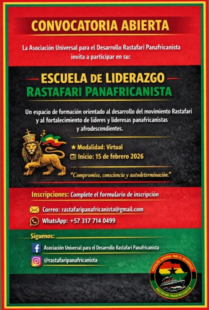 Anuncio de admisión abierta con inscripción gratuita de 50 cupos disponibles para la Escuela de Liderazgo Rastafari Panafricanista: formando líderes conscientes para la liberación, el desarrollo y la unidad de los pueblos africanos y de la diáspora.